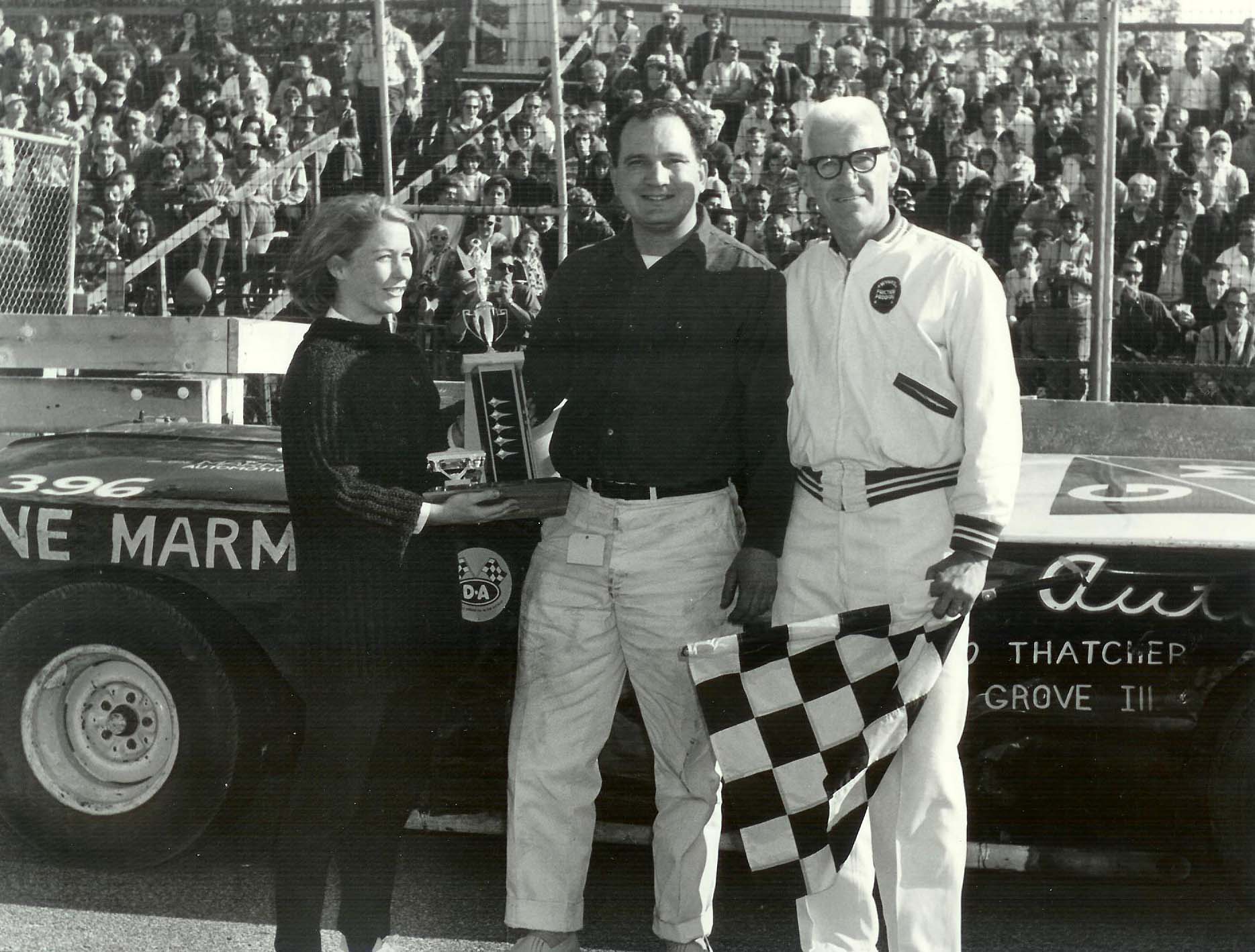 Annual Forest City 200 at the Rockford Speedway in 1964. After his win, Marmor is joined by (left to