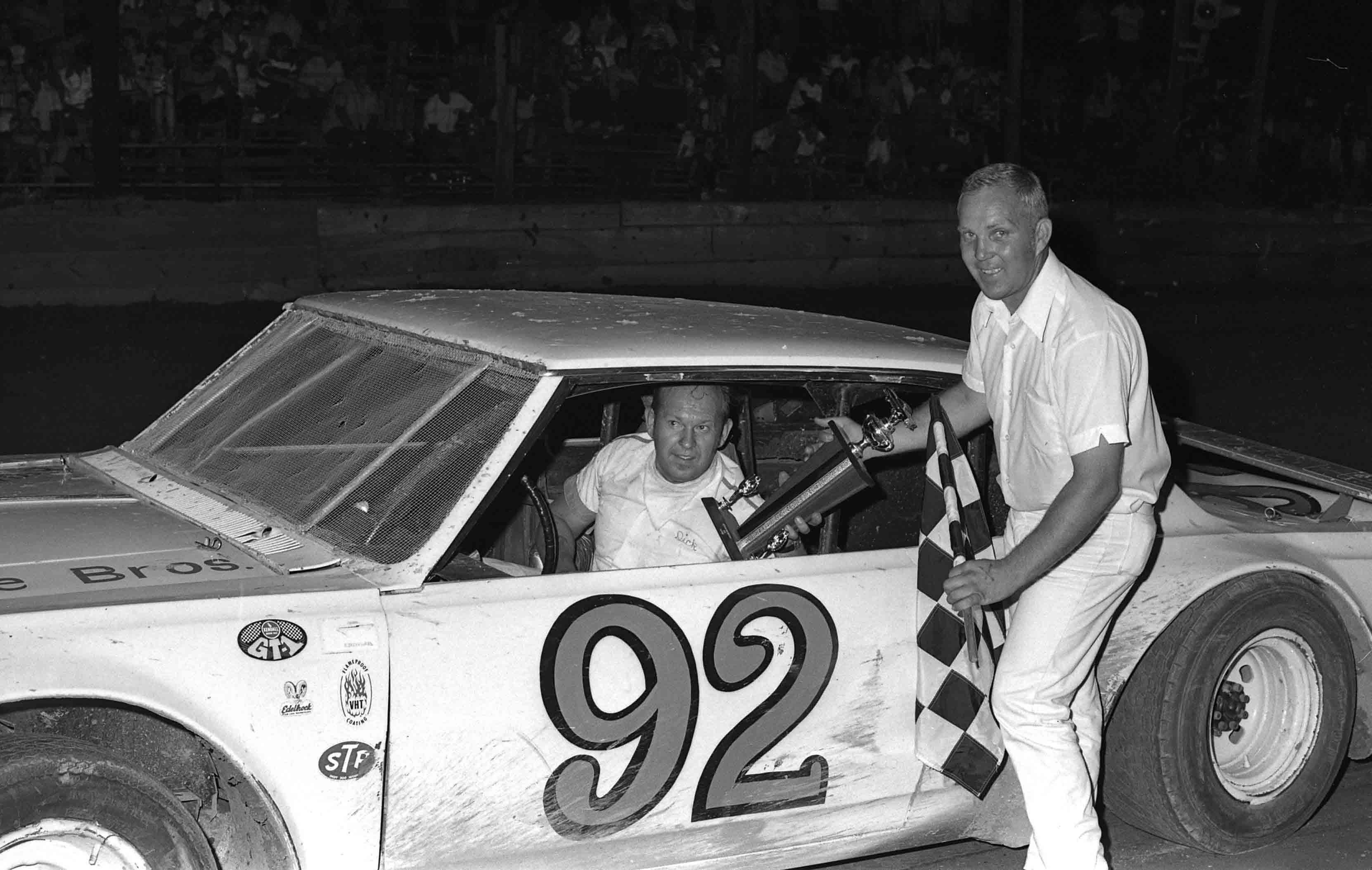 Carrying the checkered flag after a win in his coupe- May 24, 1964